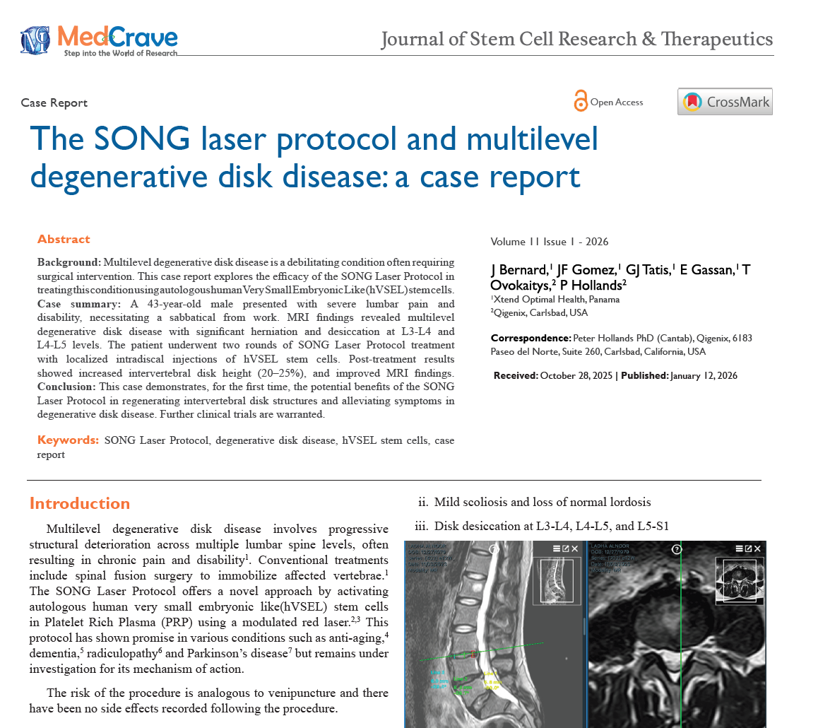 This case report describes a patient with severe lumbar degenerative disc disease who showed reduced pain, improved function, and increased disc height after treatment with the SONG Laser Protocol using autologous hVSEL stem cells. The authors suggest this minimally invasive approach may have regenerative potential, but emphasize the need for larger clinical trials.